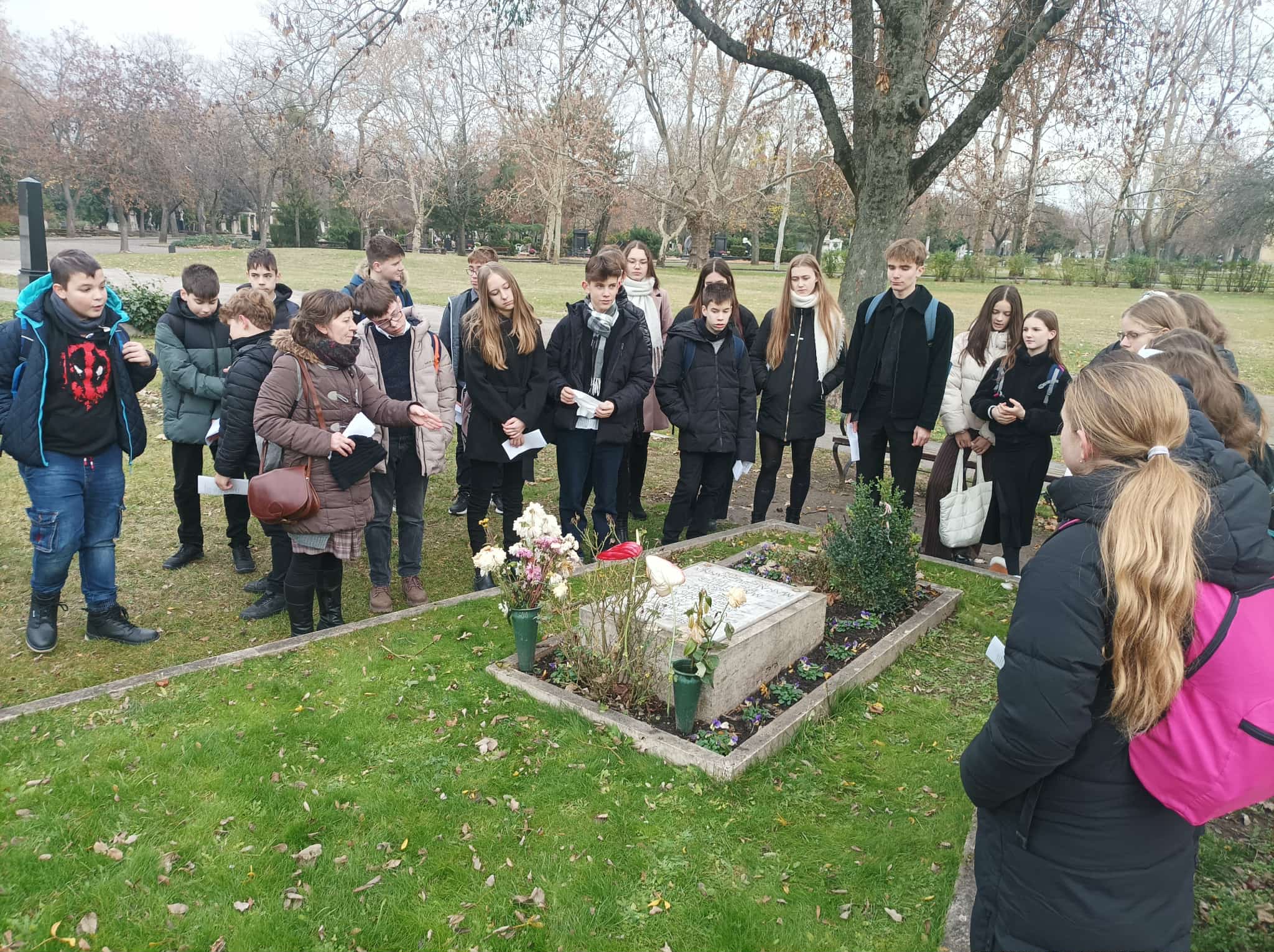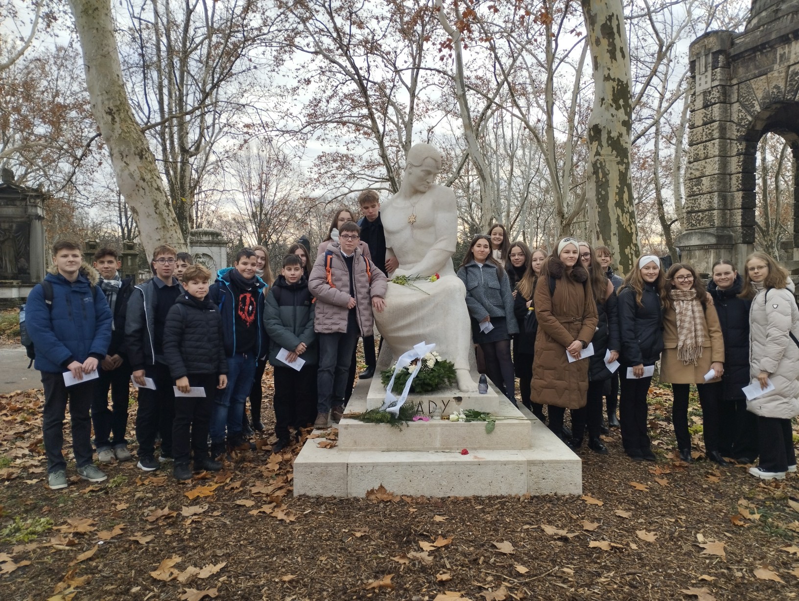 Az előadás előtt meglátogatták a Fiumei úti temetőben a 200 éve született Jókai Mór síremlékét, a tisztelet kis koszorúját helyeztek el Ady Endre és József Attila sírjára.