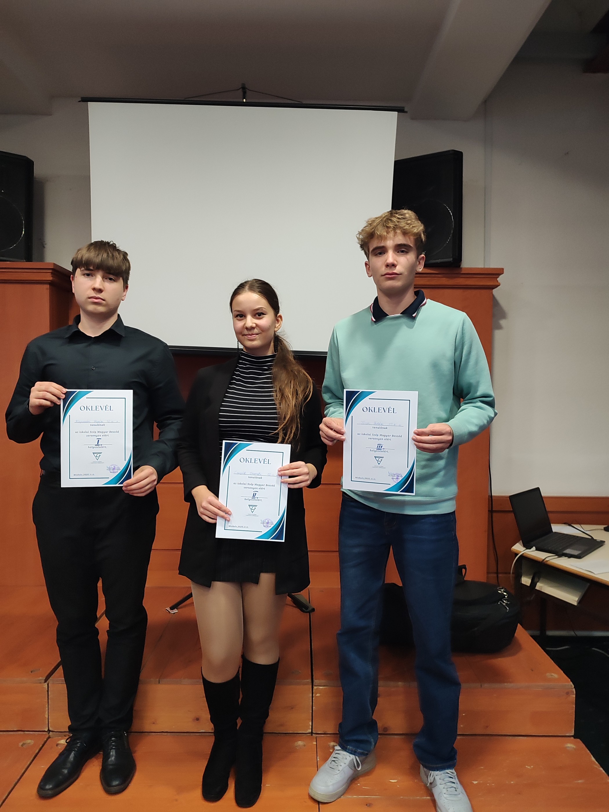 2025. november 11.-én tartottuk meg iskolánkban a Szép magyar beszéd verseny iskolai fordulóját a felsőgimnazisták számára. Ezen az alábbi eredmények születtek: