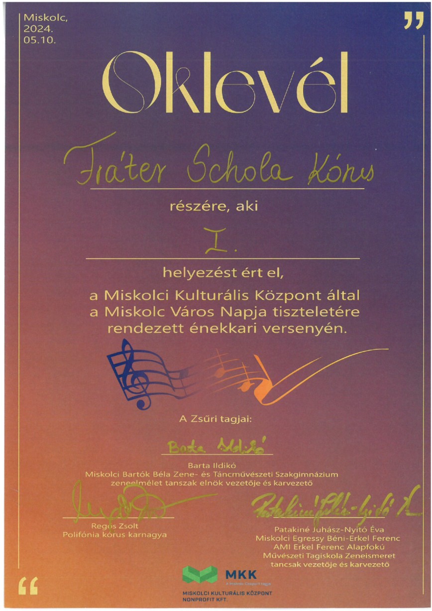 A Fráter schola Viridis - iskolánk alsós kórusa, a Miskolc Város Napja alkalmából rendezett kórusversenyen I. helyezést ért el kategóriájában.